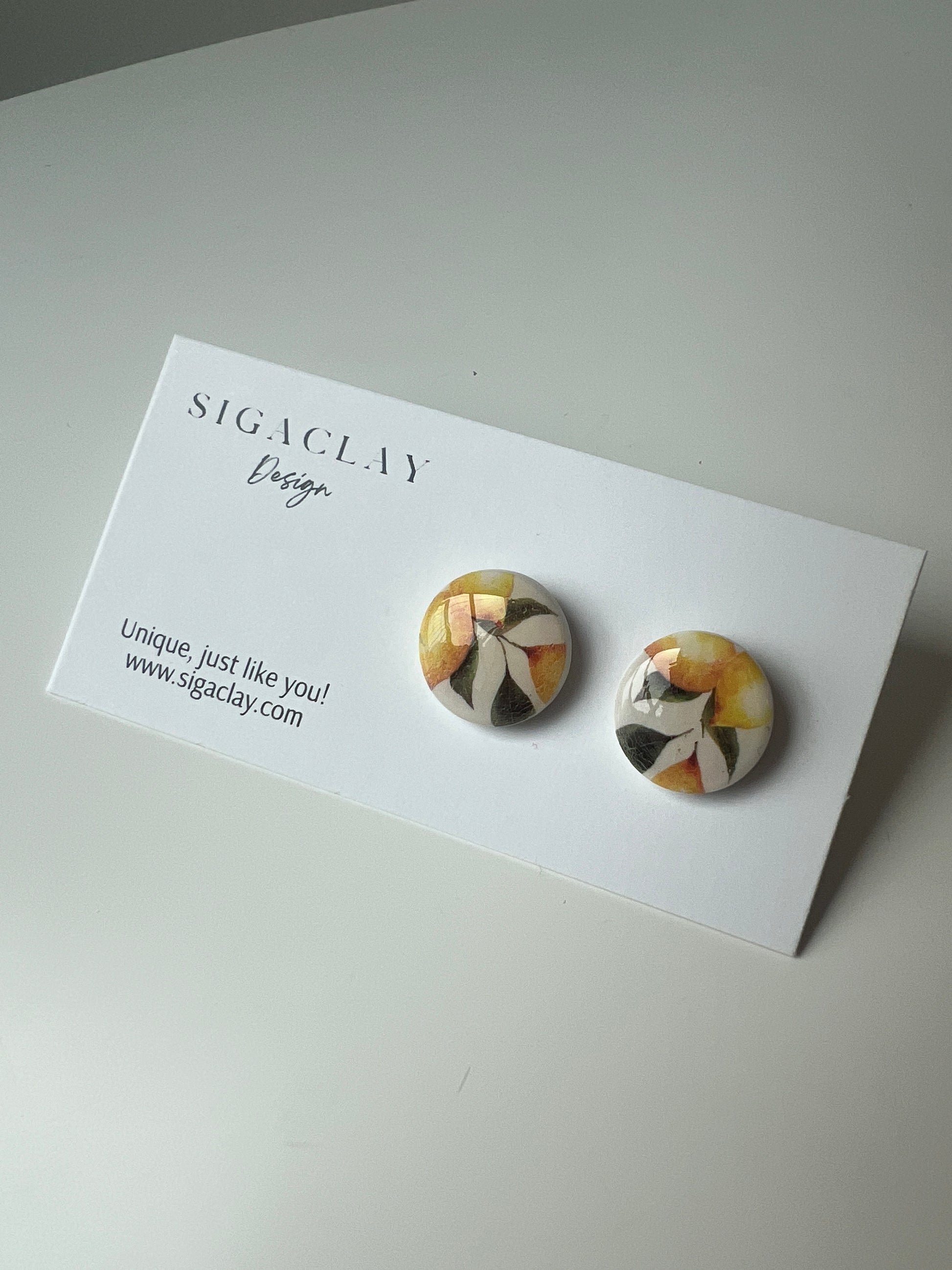 Visi „Siga Clay“ auskarai yra rankų darbo iš polimerinio molio – prašome su jais elgtis atsargiai. Nedėkite ant auskarų sunkių daiktų ir neleiskite jiems sulinkti, kad nesulūžtų. Laikykite auskarus atokiau nuo aliejų ir kvepalų.