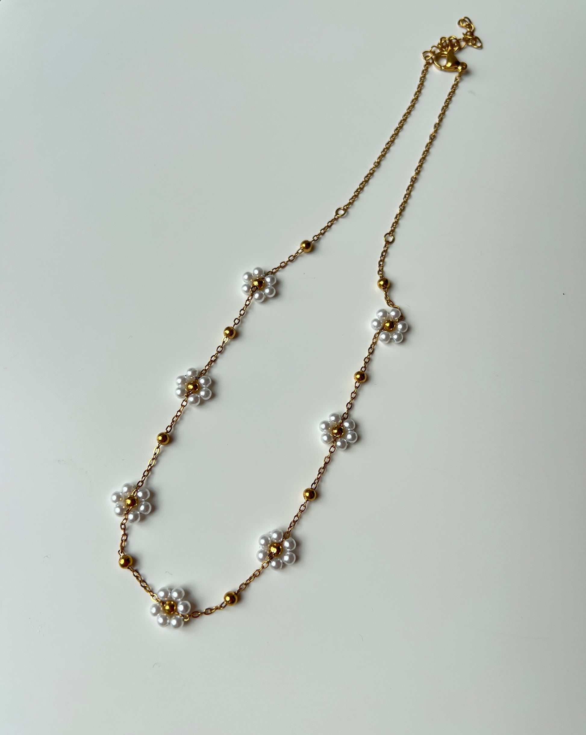 Žaismingas ir elegantiškas vėrinys, dekoruotas subtiliomis ramunėlėmis iš baltų perliukų ir aukso spalvos karoliukų. Vėrinys pagamintas iš nerūdijančio plieno – atsparus drėgmei ir neblunkantis, todėl puikiai tinka kasdieniam nešiojimui ar šventėms.