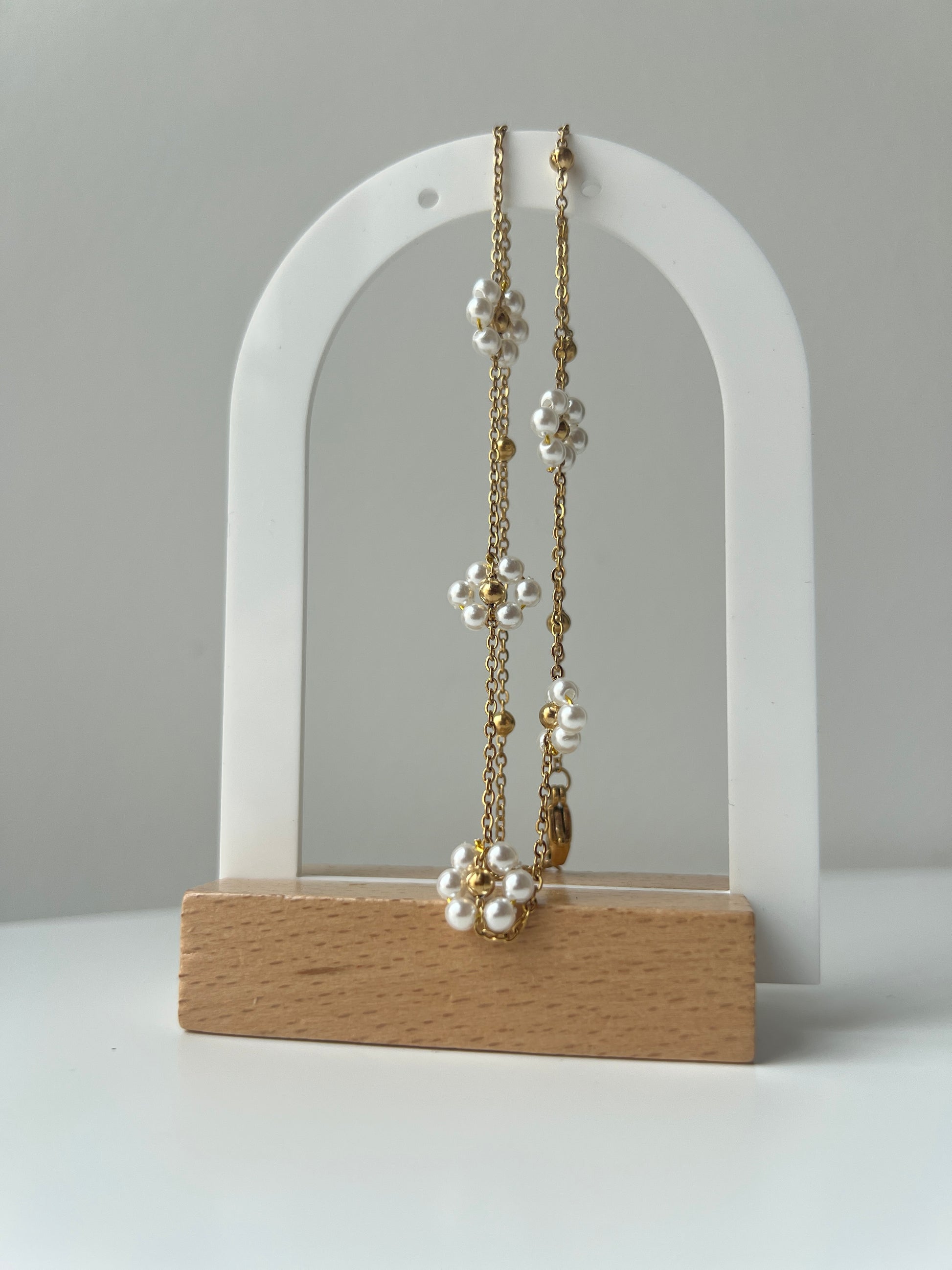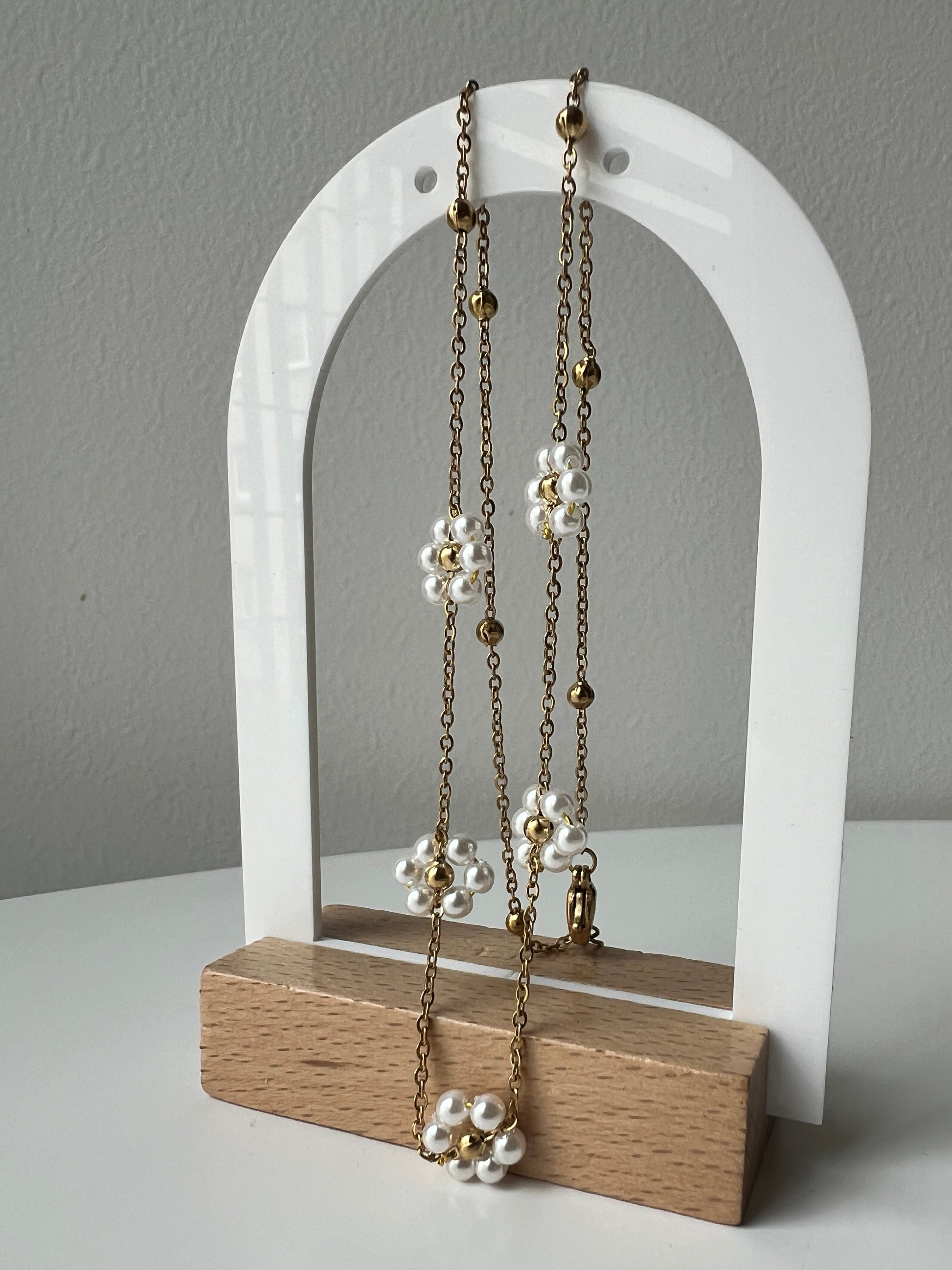 Žaismingas ir elegantiškas vėrinys, dekoruotas subtiliomis ramunėlėmis iš baltų perliukų ir aukso spalvos karoliukų. Vėrinys pagamintas iš nerūdijančio plieno – atsparus drėgmei ir neblunkantis, todėl puikiai tinka kasdieniam nešiojimui ar šventėms.